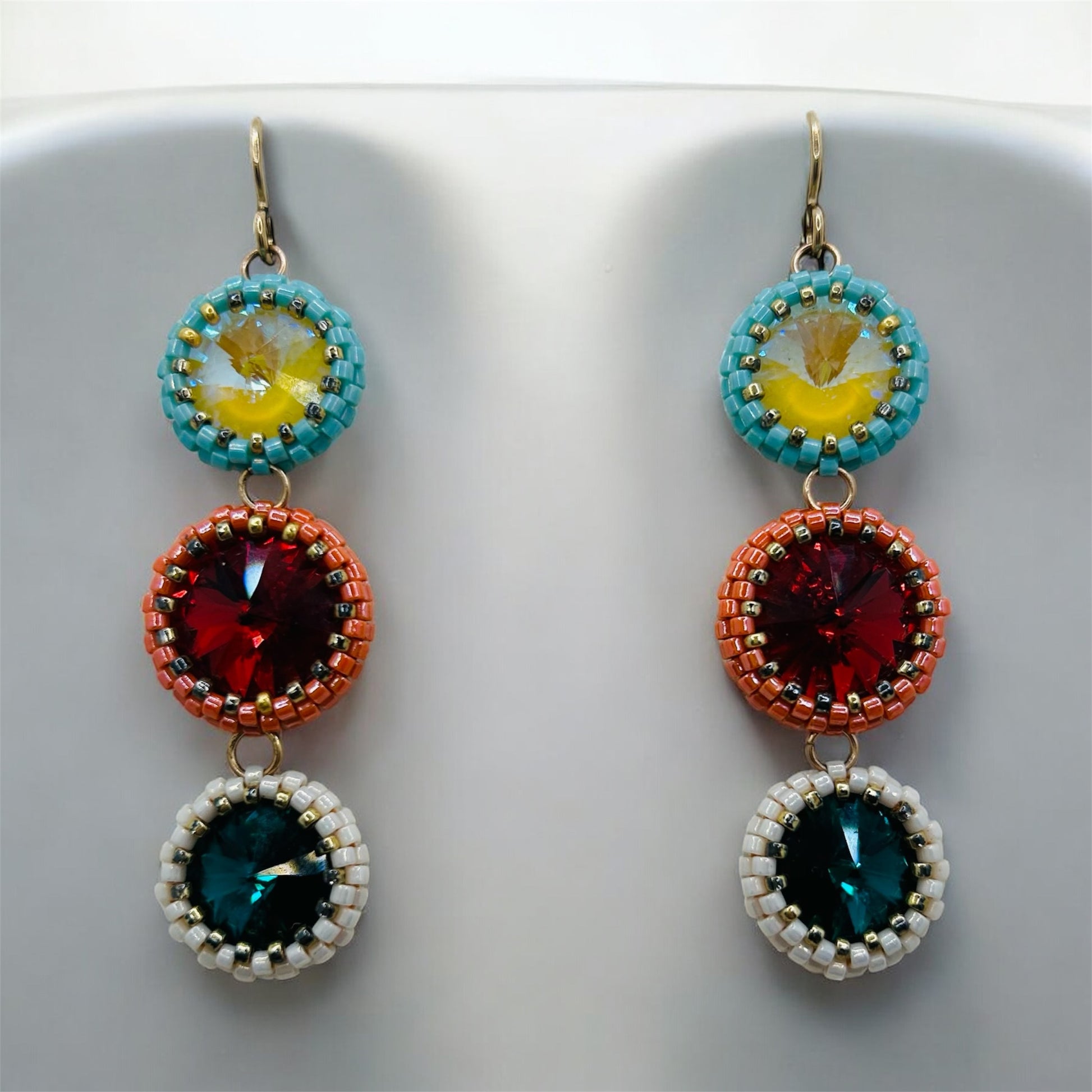 Vibrant, elegant and full of light — the Cosmic Trio Crystal Drops feature three bezel-set crystals hand-stitched with premium TOHO AIKO Japanese beads, known for their exceptional uniformity and high-end quality.