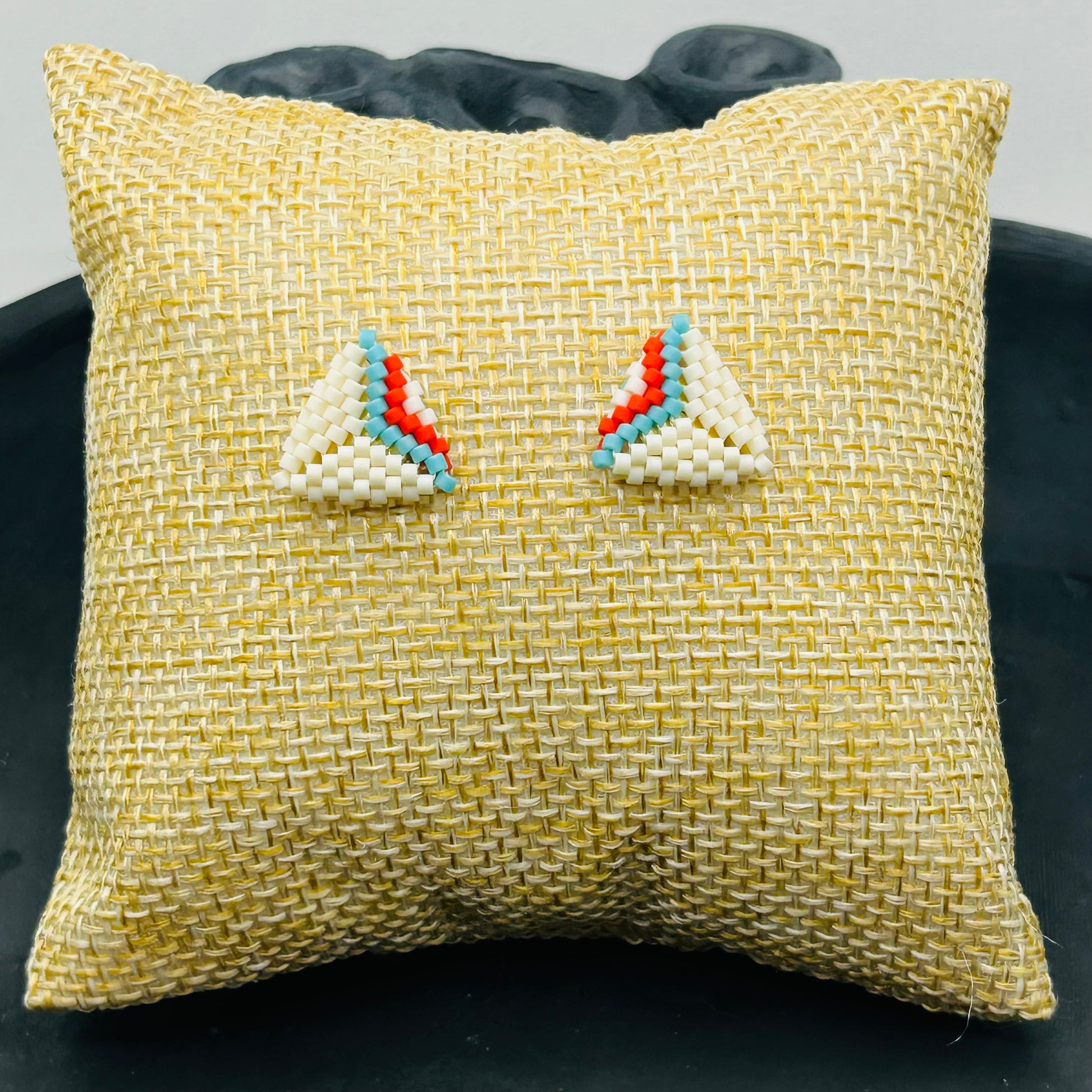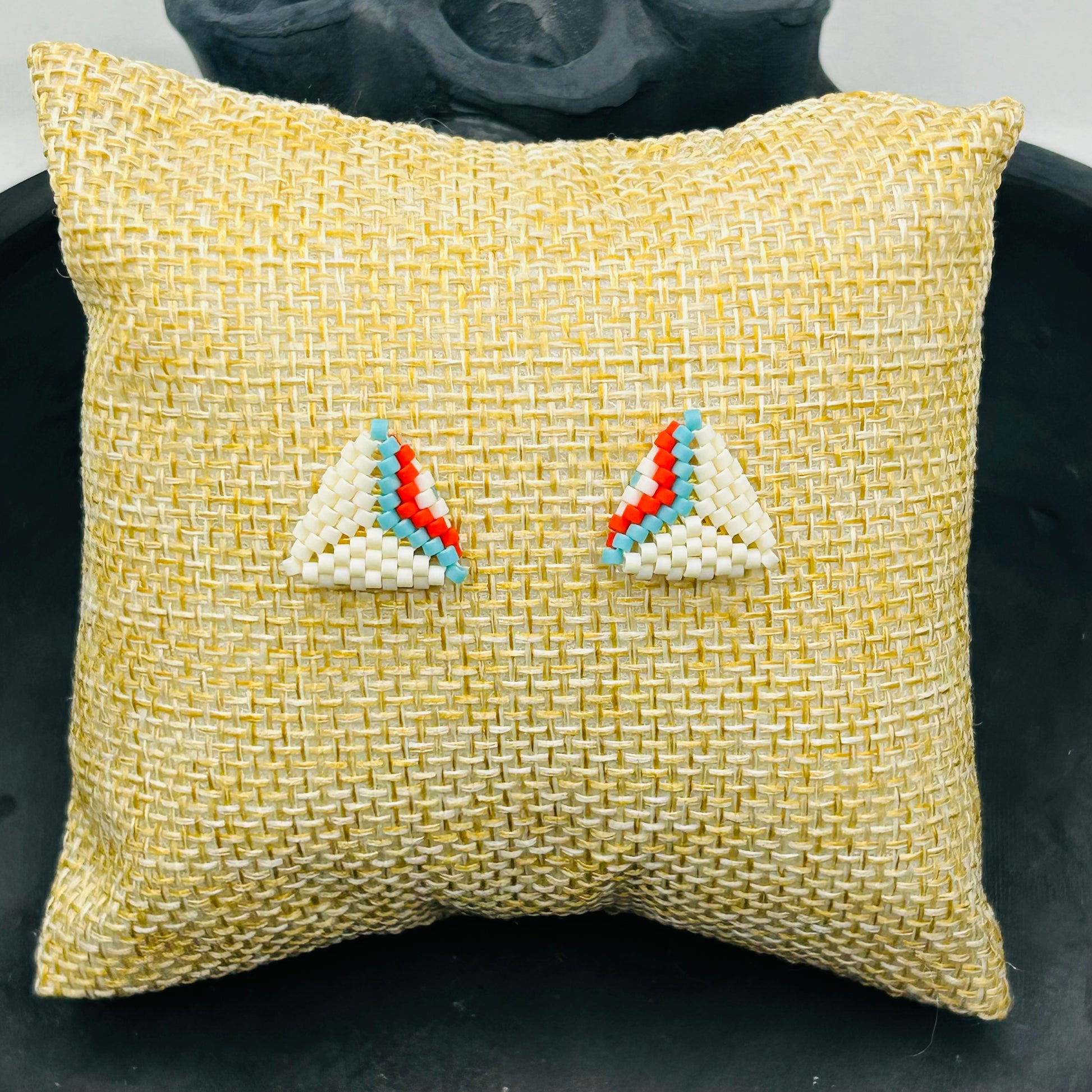 Crafted with crisp white beads and accented with turquoise and bright red lines, these studs resemble a sunrise over warm sand — calm, fresh, and full of life.