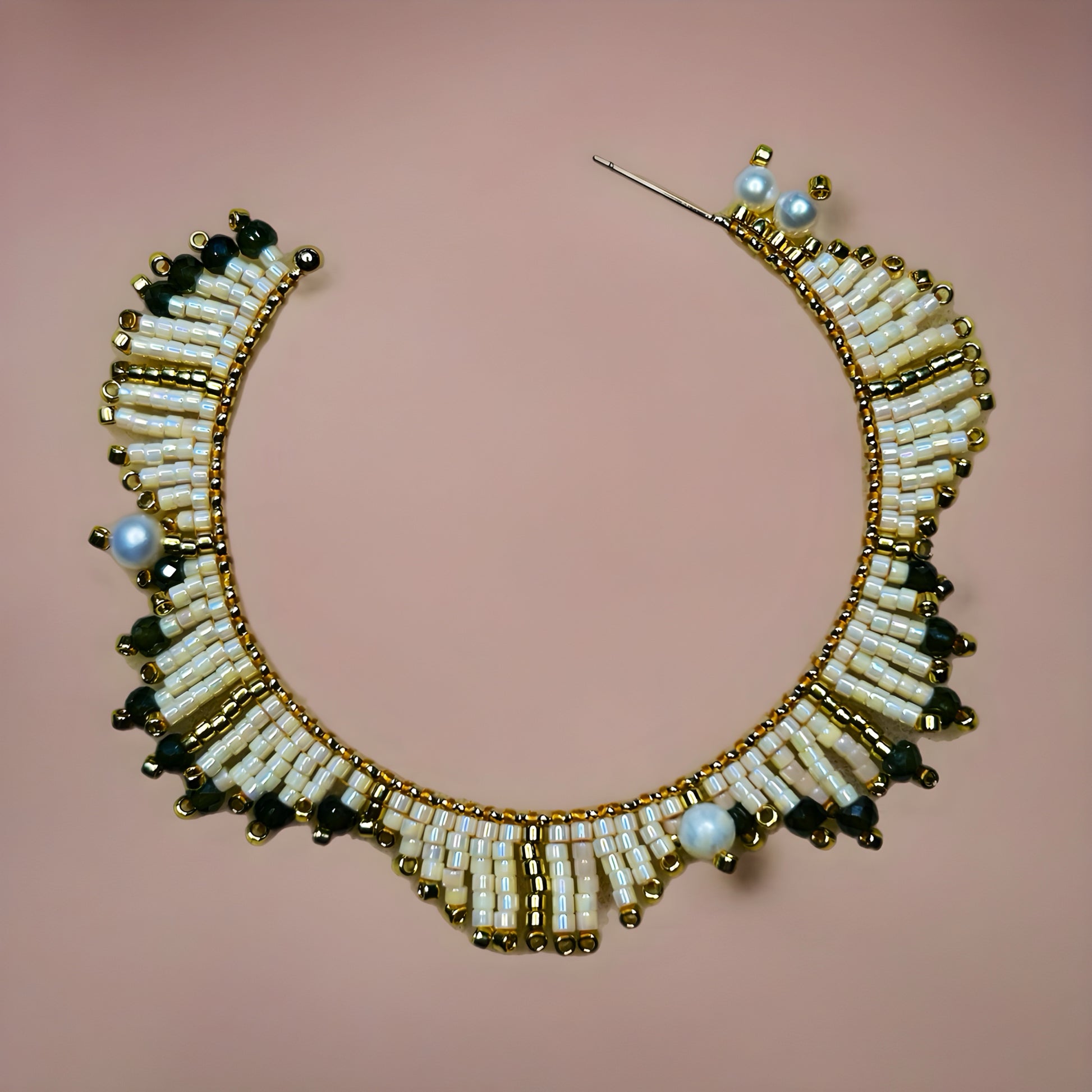 Cada par está tejido a mano con cuentas Japonesas TOHO AIKO y Zirconias Verde obscuro con un toque especial con perlas.