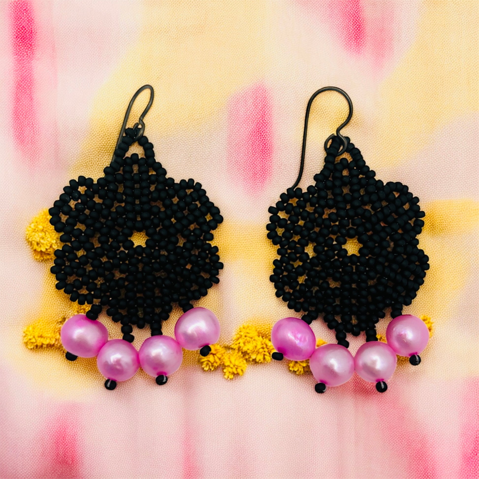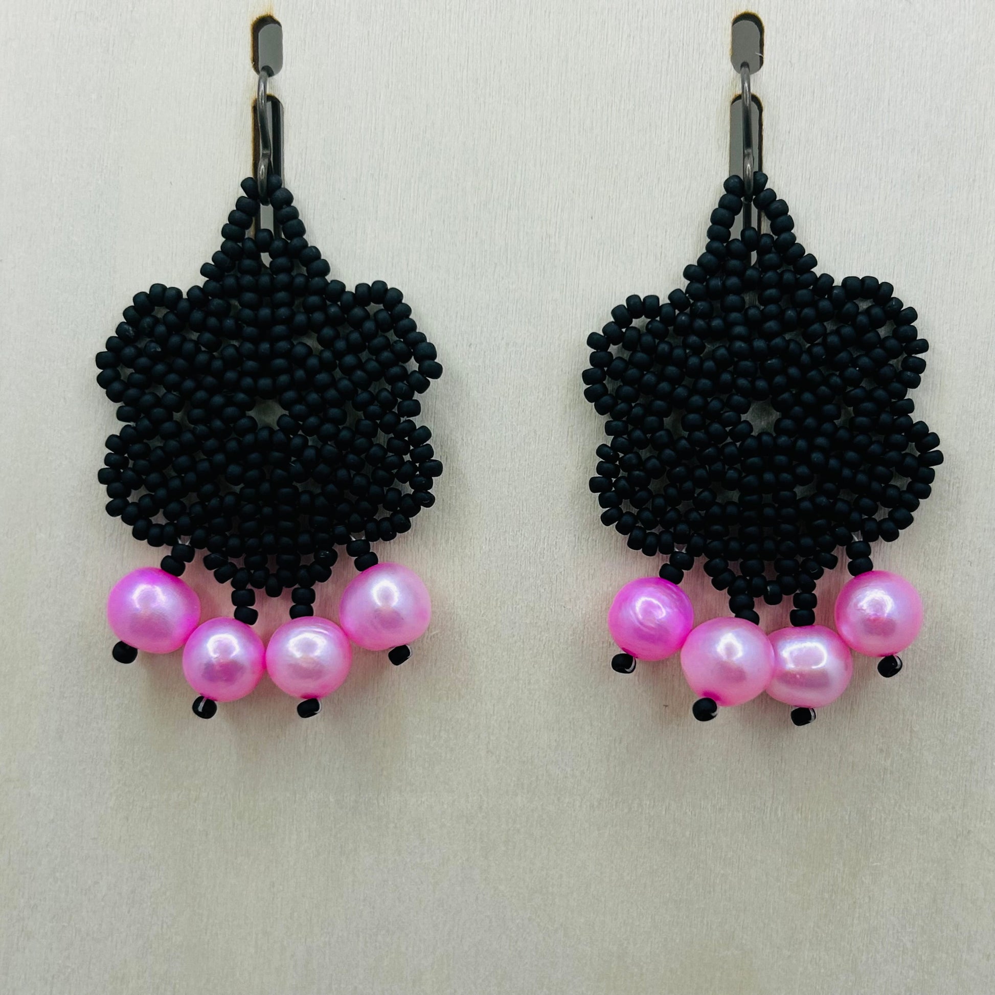 Delicate handcrafted earrings featuring a matte black beaded flower and bubble-gum pink pearl drops. Lightweight, modern, and perfect for adding a soft pop of color to any outfit. A unique pair designed to stand out with elegance and charm.