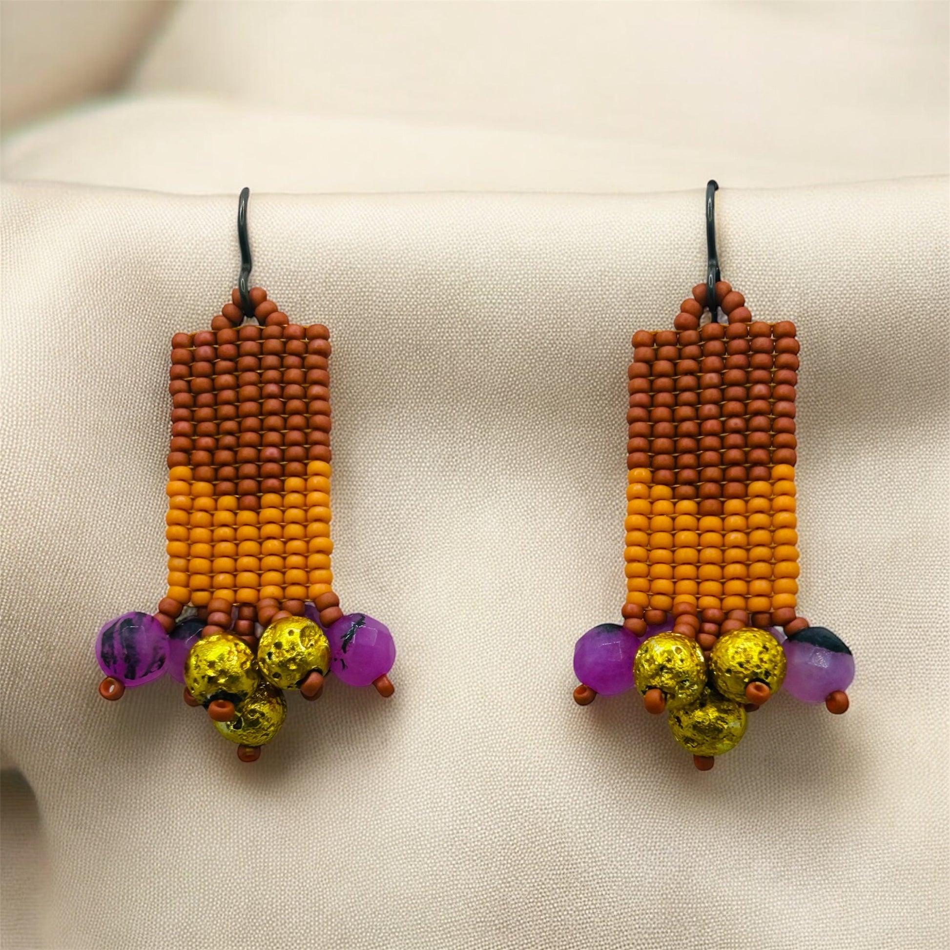Handwoven with earthy brown and deep amber seed beads, these earrings cascade naturally into vibrant bead drops featuring metallic gold and rich amethyst purple tones. Their flow and color contrast make them a striking statement piece that feels both organic and luxurious.