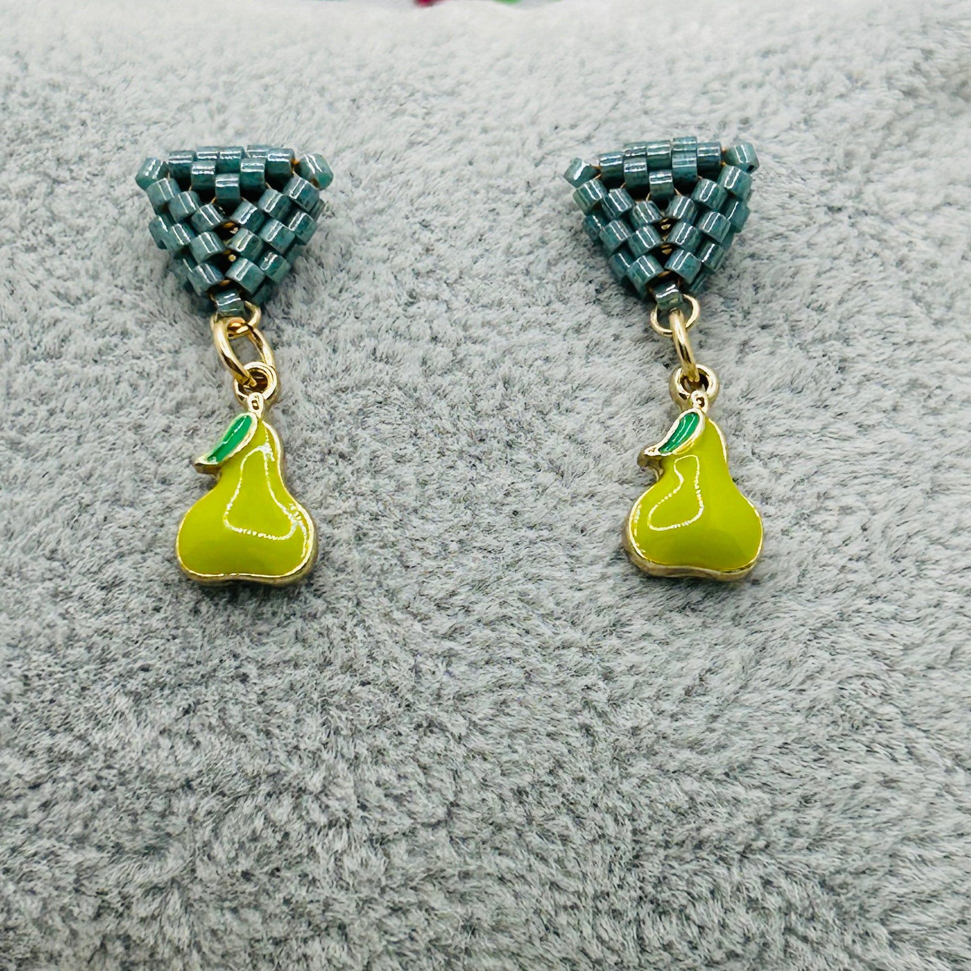 These earrings feature small hand-woven triangles crafted with premium seed beads, paired with a charming pear pendant that swings gently with every move. The cool hues of the beadwork contrast beautifully with the vibrant pear charm, creating a fun yet elegant accessory perfect for everyday wear.
